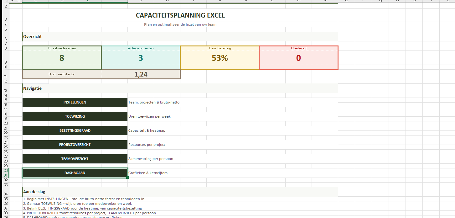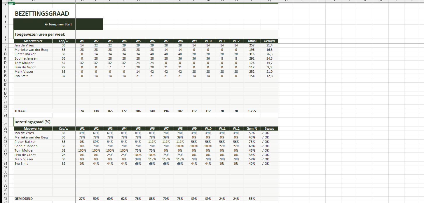 Heeft u moeite om de werkbelasting van uw team in balans te houden? Dit sjabloon biedt een compleet overzicht — van bruto-netto capaciteitsberekening tot bezettingsgraad per medewerker — zonder dat u zelf formules hoeft te bouwen.