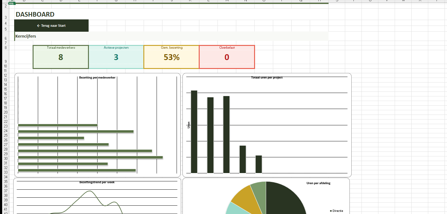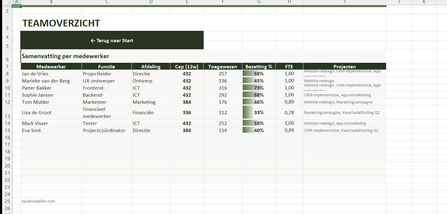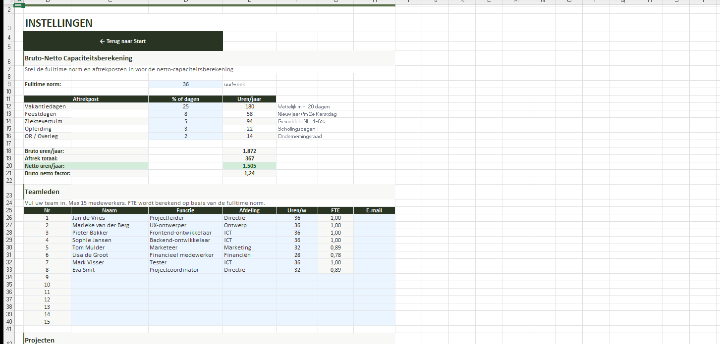 Het sjabloon bevat 7 gekoppelde werkbladen met meer dan 1.990 automatische formules, 6 grafieken en ruimte voor 15 medewerkers en 10 projecten over een periode van 12 weken. Inclusief deeltijdfactor, FTE-berekening en overbelasting-detectie.