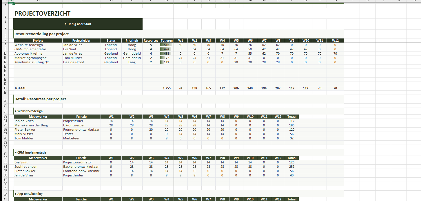 Resourceverdeling per project met totale uren, aantal resources en weekoverzicht. Detailblok toont per project welke medewerkers zijn ingezet.