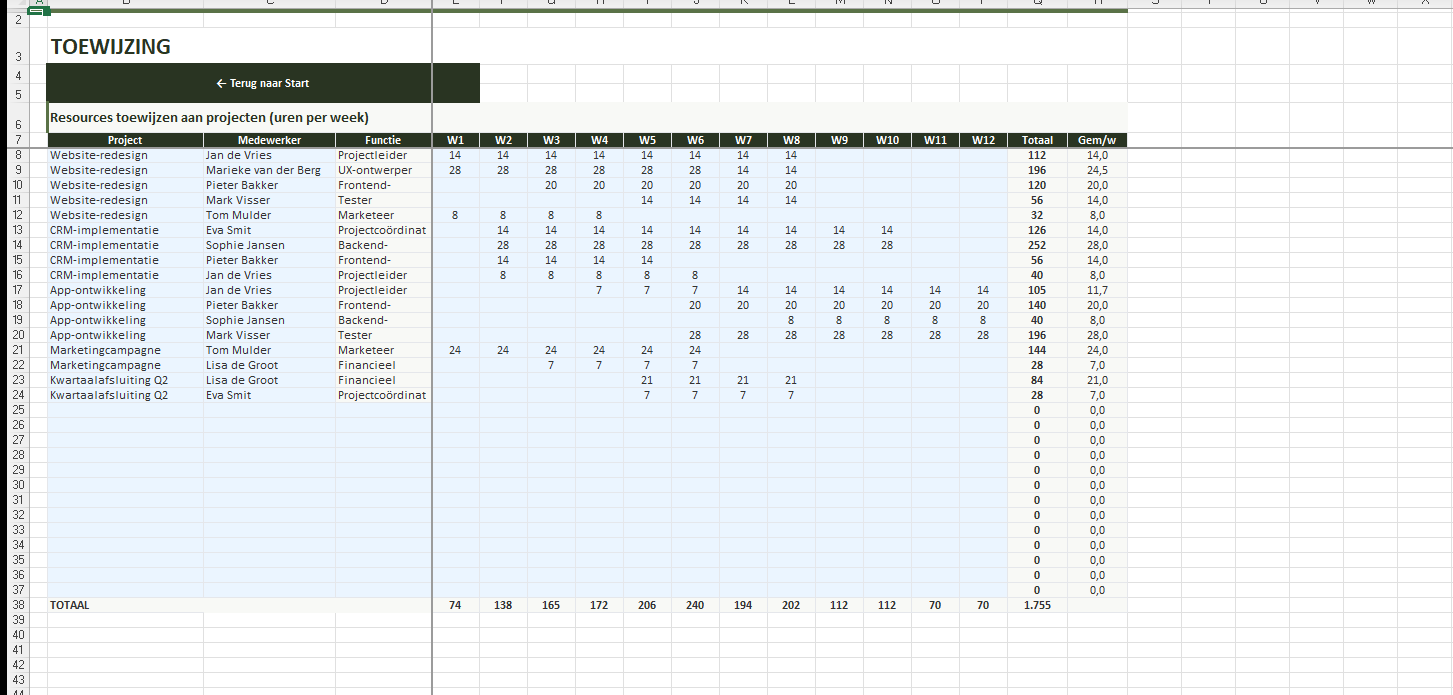 Wijs uren toe per medewerker, per project, per week. Maximaal 30 toewijzingsregels over 12 weken met automatische totalen en gemiddelden.