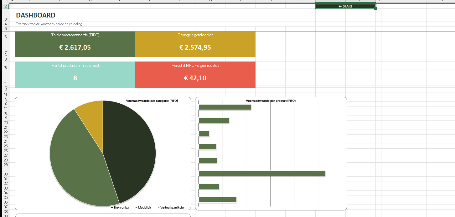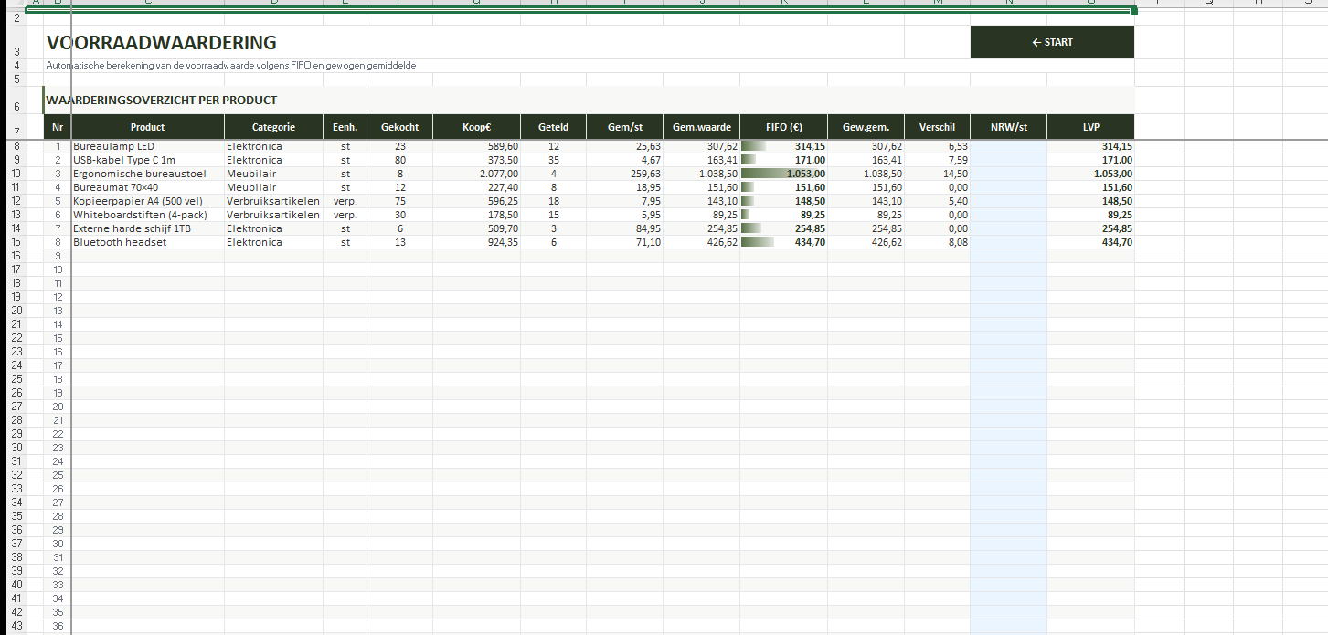Een complete voorraadwaardering in Excel met automatische FIFO-berekening, vergelijking met gewogen gemiddelde, LVP-waardering en dashboard. Geschikt voor eenmanszaak, VOF en BV. Ontwikkeld volgens goed koopmansgebruik en de regels van de Belastingdienst.