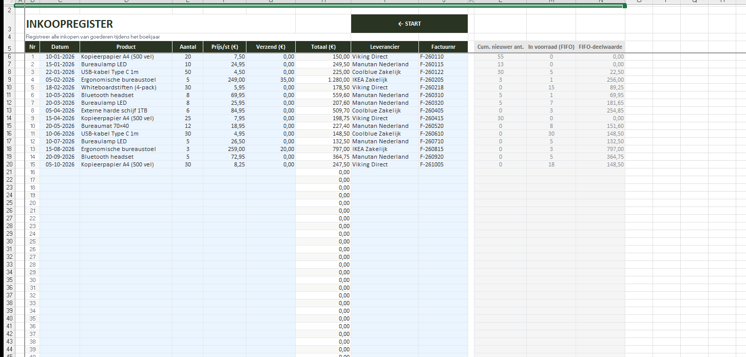 Log inkopen chronologisch. De FIFO-helperkolommen berekenen automatisch welke lagen nog op voorraad zijn.