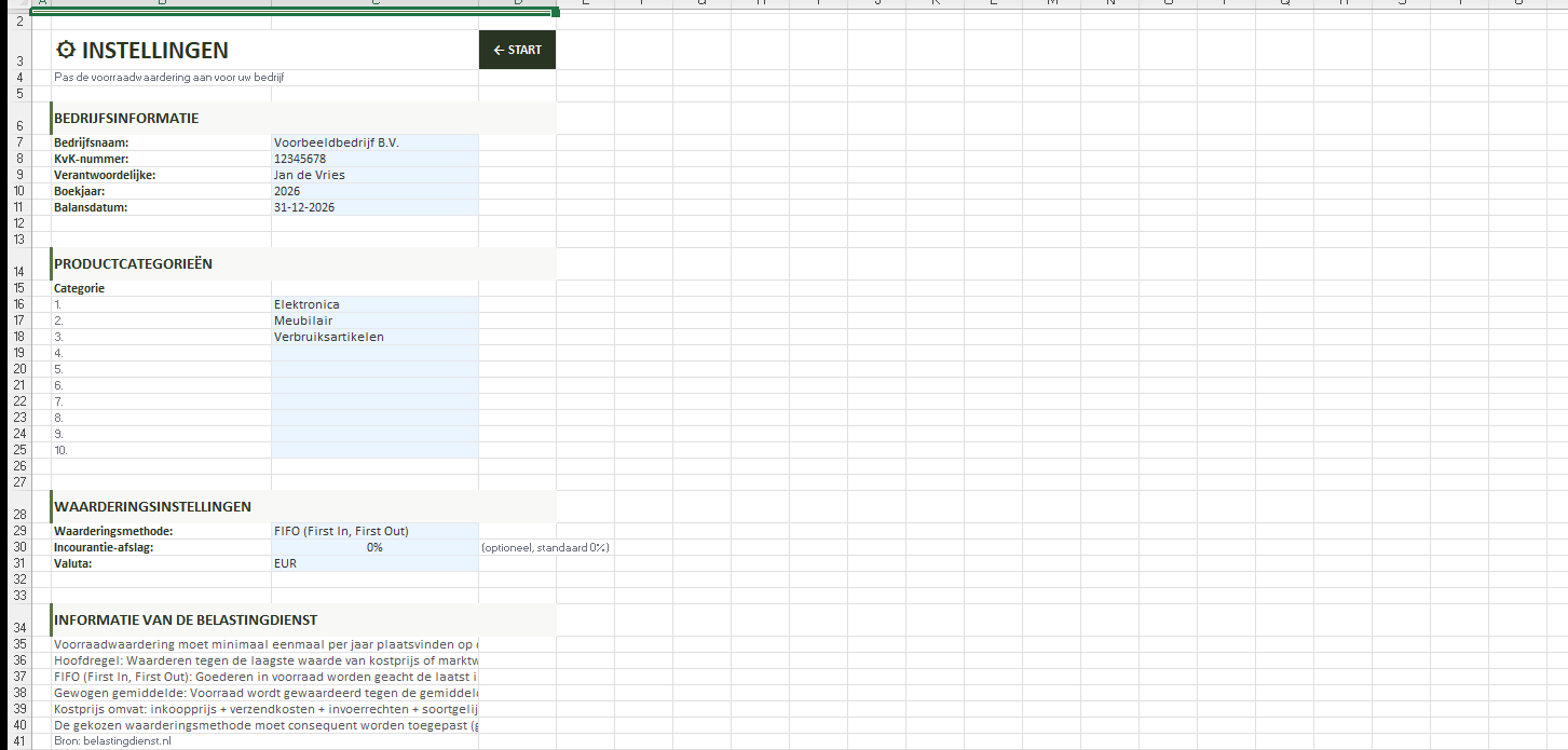 Bedrijfsgegevens, productcategorieën, waarderingsmethode en incourantie-afslag. Alles wordt automatisch doorberekend in het hele werkboek.