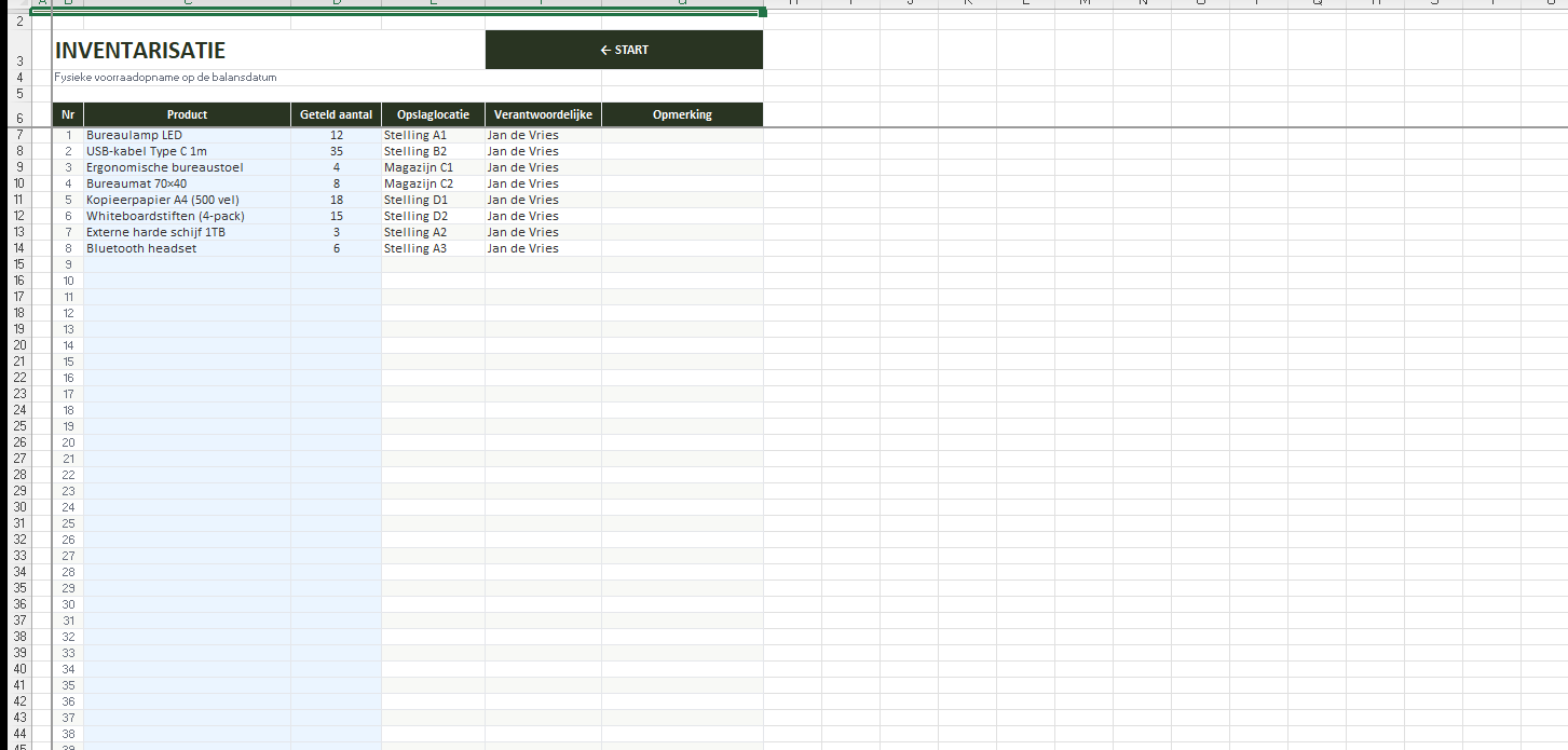 Registreer de fysieke voorraadopname op de balansdatum. Per product: geteld aantal, opslaglocatie, verantwoordelijke en opmerking.