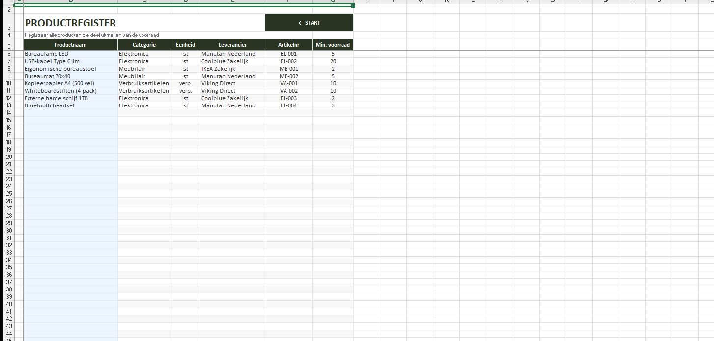 Registreer tot 50 producten met categorie, eenheid, leverancier en artikelnummer. Dropdown-menu’s voor categorie en eenheid voorkomen invoerfouten.