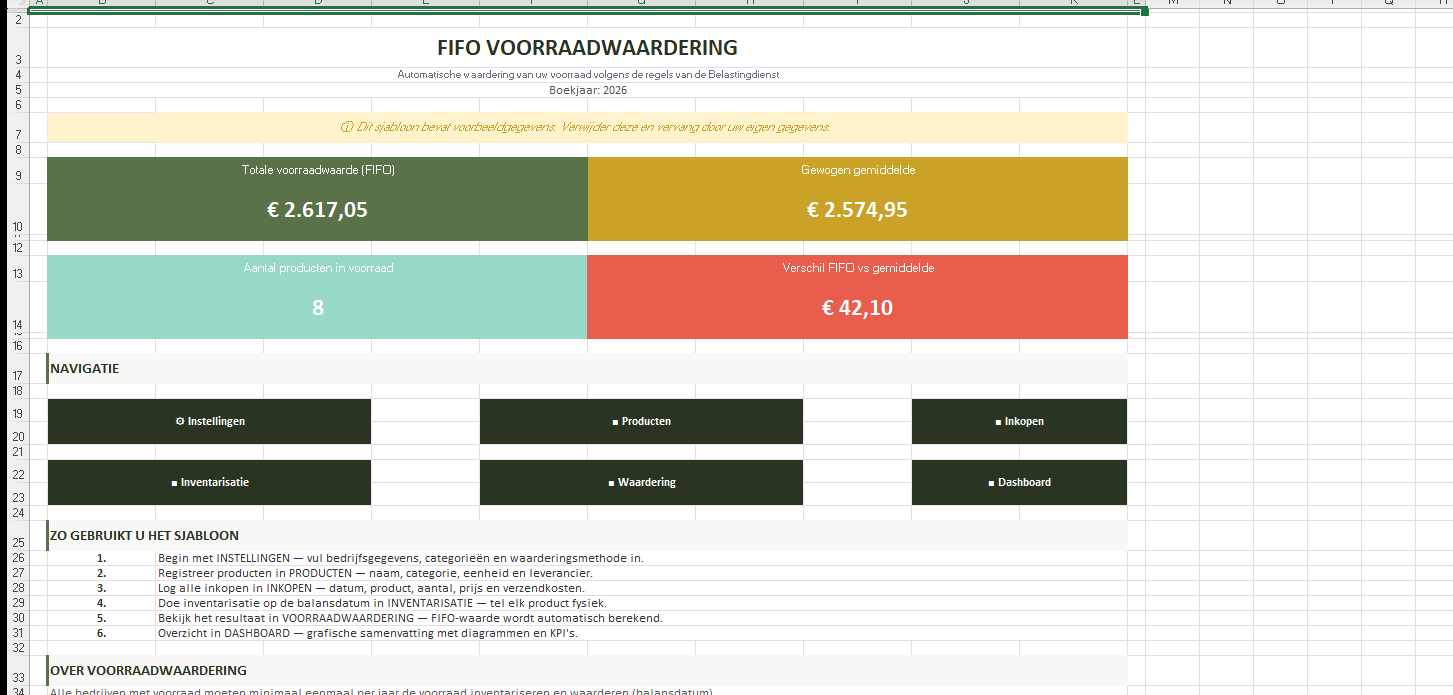 De onderstaande schermafbeeldingen tonen het sjabloon met voorbeeldgegevens. Na aankoop kunt u deze vervangen door uw eigen producten en inkopen. Dit sjabloon is een hulpmiddel voor de interne voorraadwaardering en vervangt geen professioneel boekhoudkundig advies. De gekozen waarderingsmethode moet consequent worden toegepast (bestendige gedragslijn). Raadpleeg uw boekhouder of belastingadviseur bij twijfel.