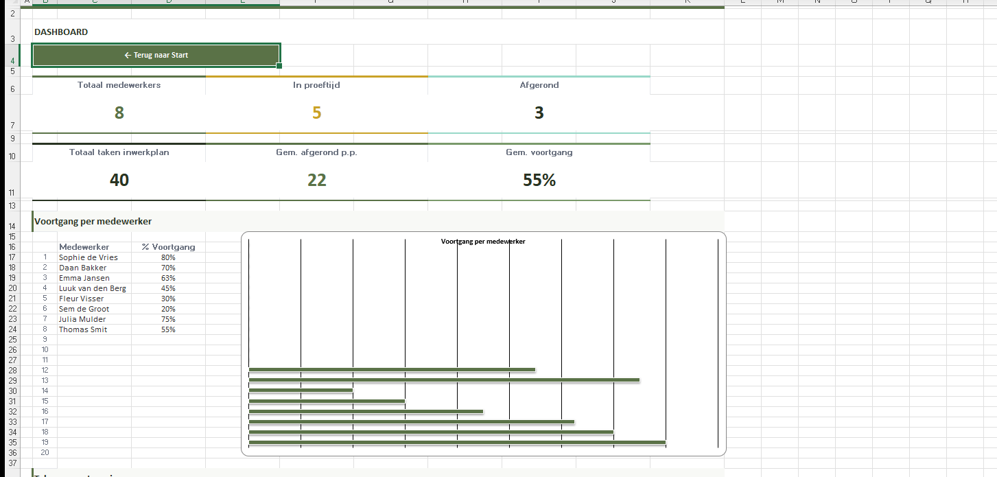 Overzichtspagina met 3 KPI’s (totaal medewerkers, in proeftijd, gemiddelde voortgang) en snelnavigatie naar alle bladen.