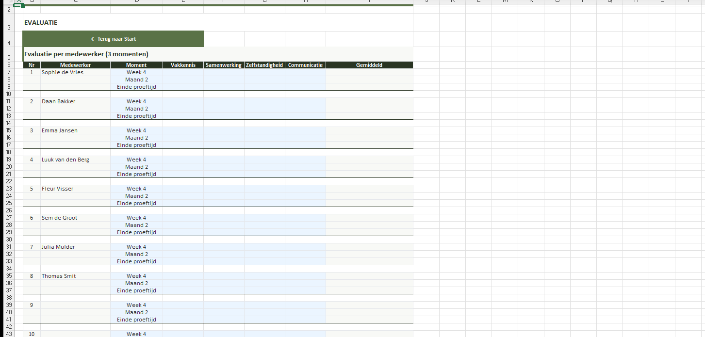3 evaluatiemomenten per medewerker (week 4, maand 2, einde proeftijd). Score 1-5 op vakkennis, samenwerking, zelfstandigheid en communicatie.