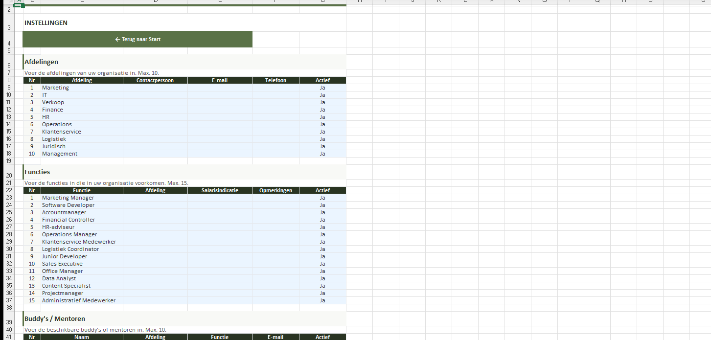 Capaciteit20 medewerkers, 40 taken, 10 afdelingen, 15 functies, 10 buddy’s