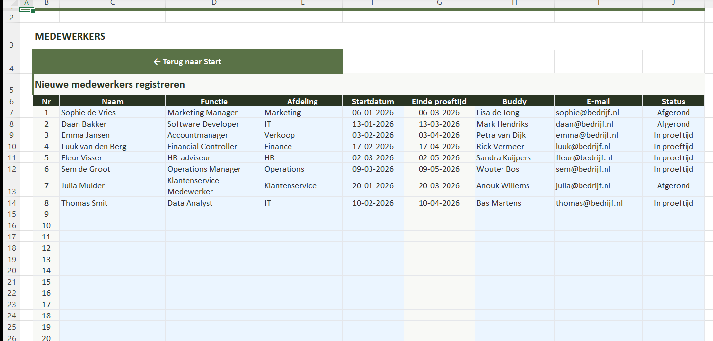 Registreer tot 20 nieuwe medewerkers met functie, afdeling, startdatum, buddy en status. Einde proeftijd wordt automatisch berekend.