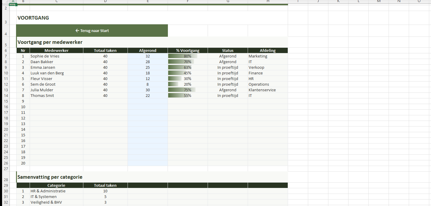 Volg de voortgang per medewerker individueel: aantal afgeronde taken, percentage en status. Met DataBar-visualisatie.