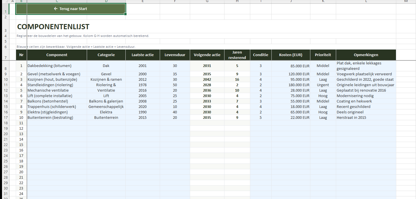 Bent u bestuurder of beheerder van een Vereniging van Eigenaren (VvE) en zoekt u een overzichtelijk onderhoudsplan in Excel? Dit sjabloon biedt een complete oplossing — van componentregistratie tot reservefondsprognose — zonder dat u zelf formules hoeft te bouwen.
