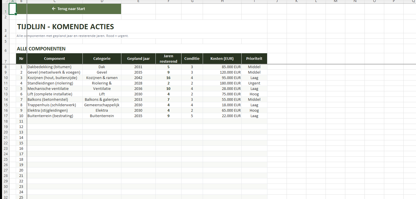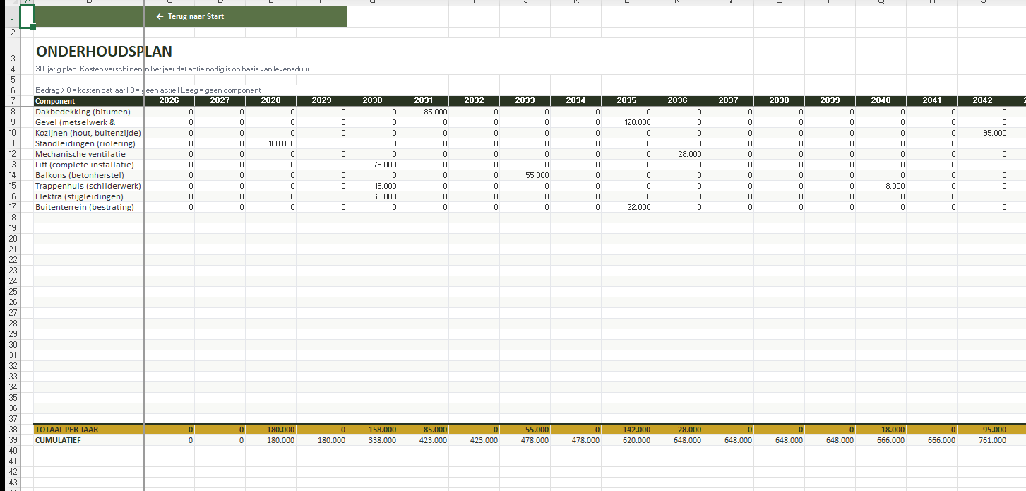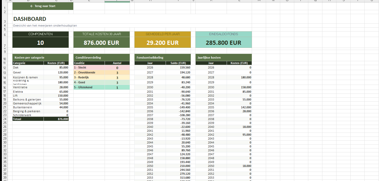 Dit Excel-sjabloon is een hulpmiddel voor interne planning en vervangt geen professioneel bouwkundig advies of officieel MJOP conform NEN 2767. Voor een wettelijk erkend meerjaren onderhoudsplan dient u een gecertificeerd bouwkundig adviseur in te schakelen. De berekeningen zijn indicatief — werkelijke kosten kunnen afwijken door inflatie, onvoorziene schade of gewijzigde regelgeving. De maker is niet aansprakelijk voor beslissingen genomen op basis van dit bestand.