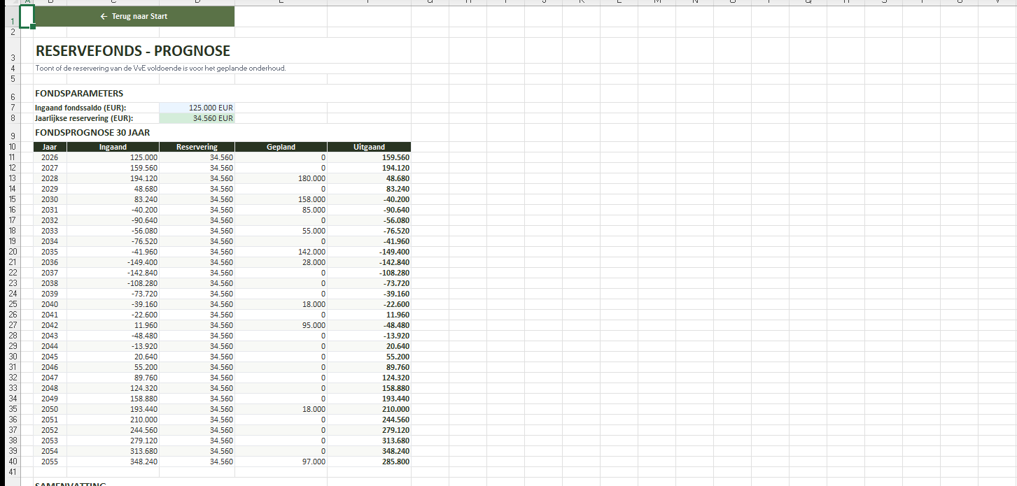 Jaarlijks overzicht van het fondssaldo: ingaand saldo, reservering, geplande kosten en uitgaand saldo. Direct zichtbaar of het fonds toereikend is.