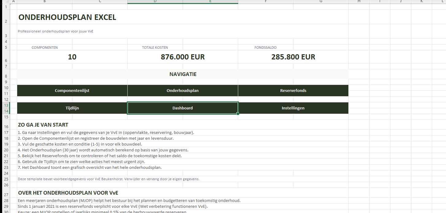 Het sjabloon bevat 7 gekoppelde werkbladen met meer dan 1.640 automatische formules, 4 grafieken en ruimte voor 30 bouwdelen over een periode van 30 jaar. Inclusief wettelijke controle op de 0,5% herbouwwaarde-eis conform de Wet verbetering functioneren VvE.