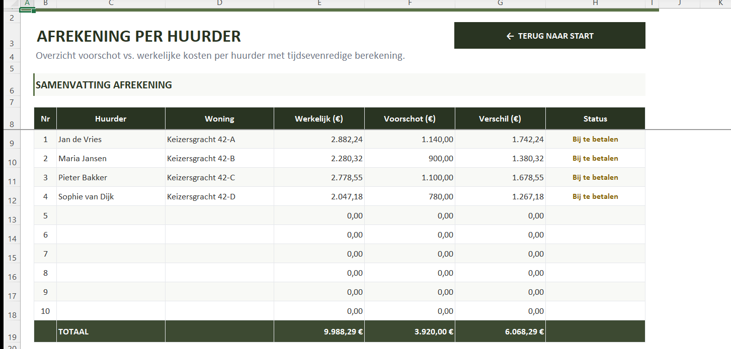 Overzicht per huurder: werkelijke kosten vs. betaald voorschot. Direct zichtbaar wie bijbetaalt en wie terugkrijgt.