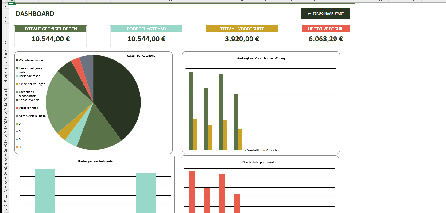 Visueel overzicht met 4 grafieken: kosten per categorie, werkelijk vs. voorschot, verdeelsleutel en nacalculatie per huurder.