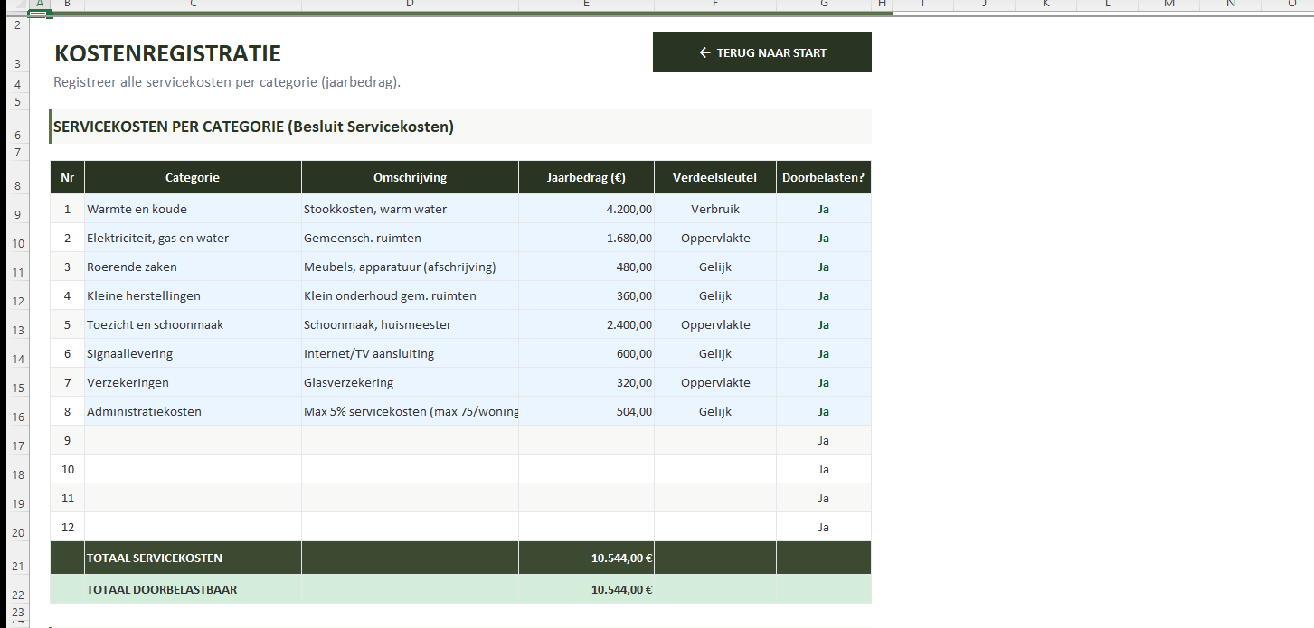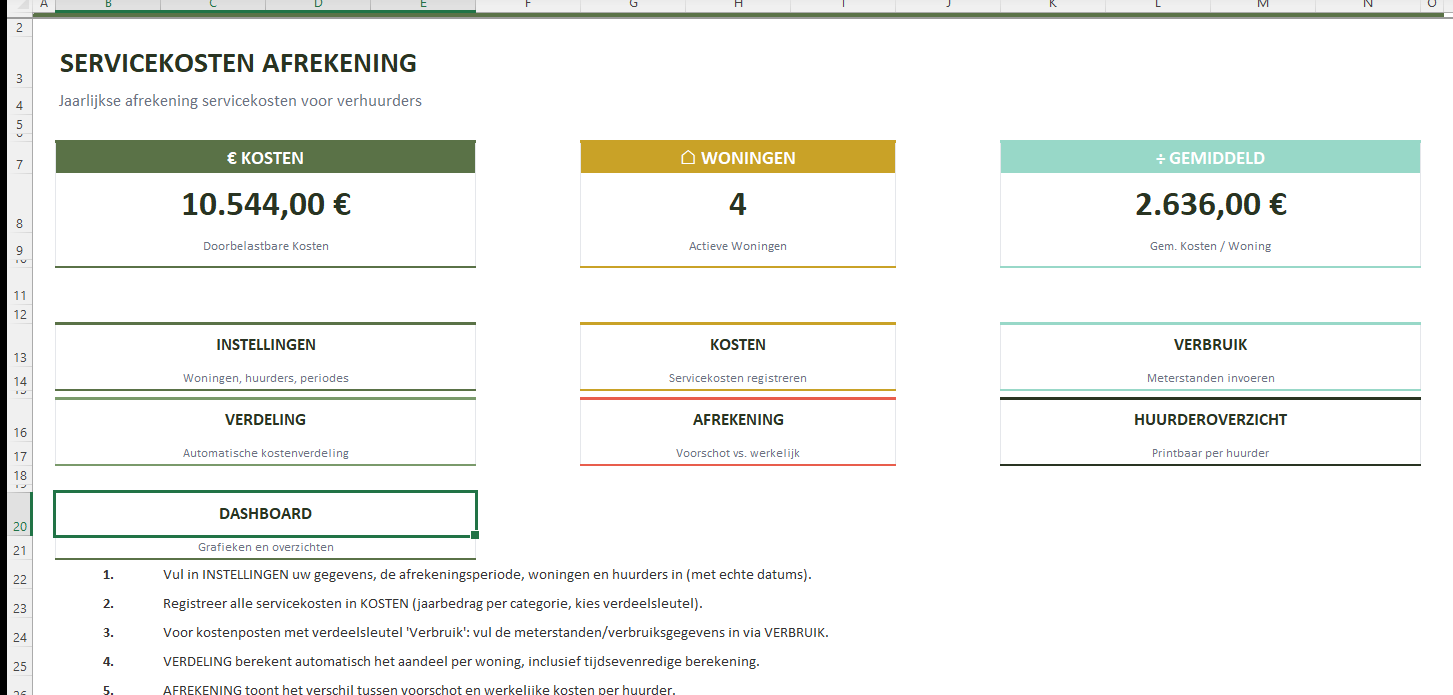 Moet u als verhuurder jaarlijks een servicekostenafrekening verstrekken aan uw huurders? Deze Excel-sjabloon automatiseert het volledige proces: van kostenregistratie tot verdeling en afrekening per huurder.