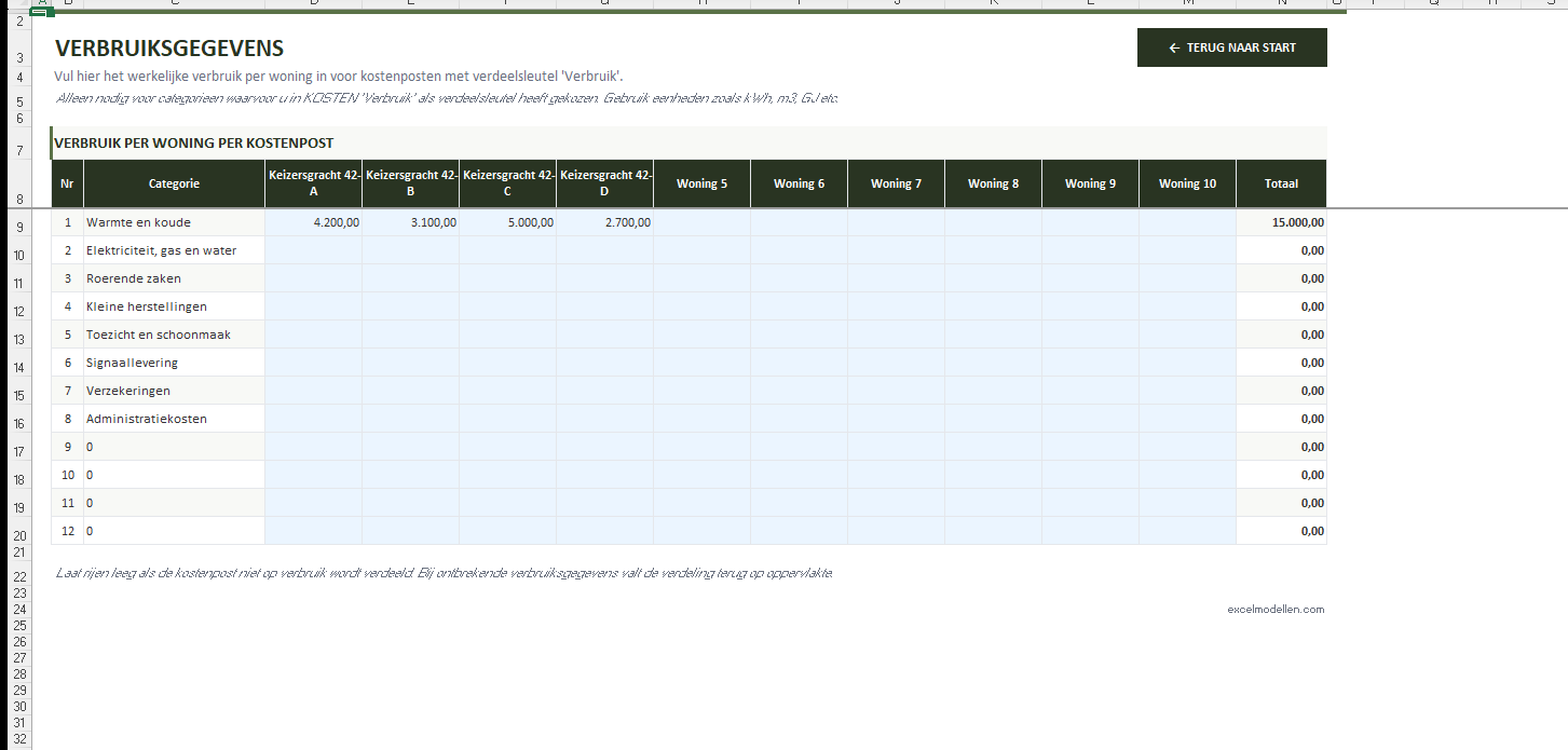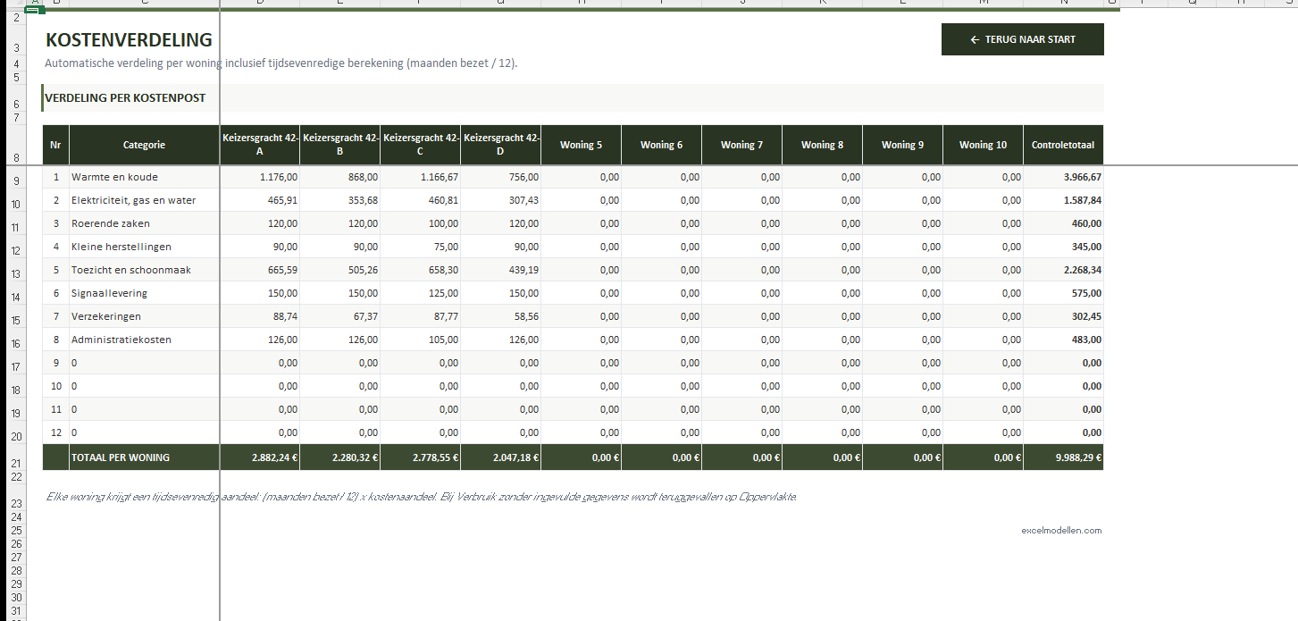 Het sjabloon bevat 8 werkbladen, 455 formules en 4 grafieken. Geschikt voor maximaal 10 woningen met 3 verdeelsleutels (oppervlakte, gelijk, verbruik) en automatische tijdsevenredige berekening bij wisseling van huurder.