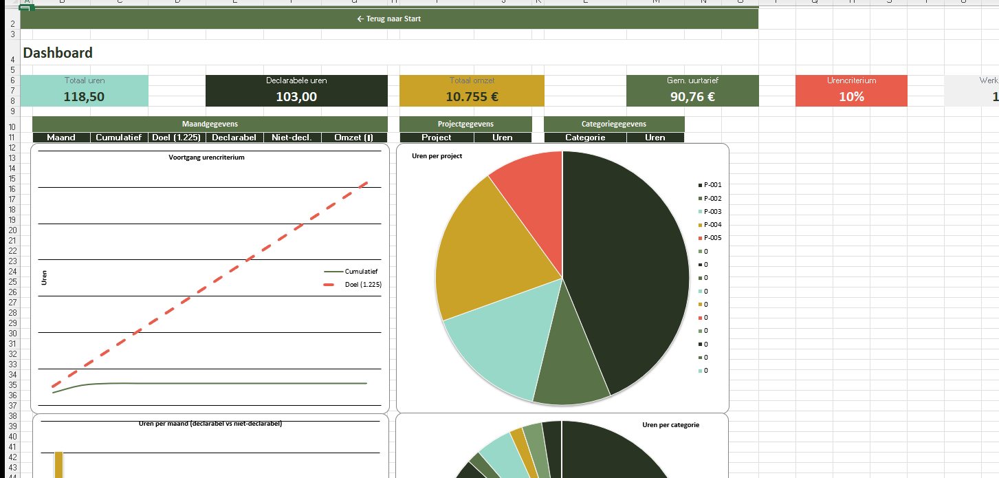 6 KPI-kaarten en 6 grafieken: urencriterium-lijn versus doel, uren per maand gestapeld, omzet per maand, en verdeling per project en categorie.