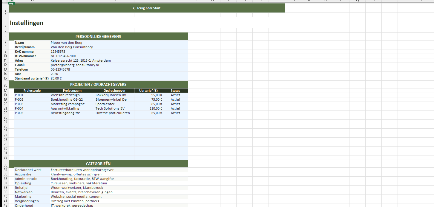 Configureer uw persoonlijke gegevens (KvK, BTW), tot 15 projecten met opdrachtgever en tarief, 10 categorieën en uw standaard werkschema.