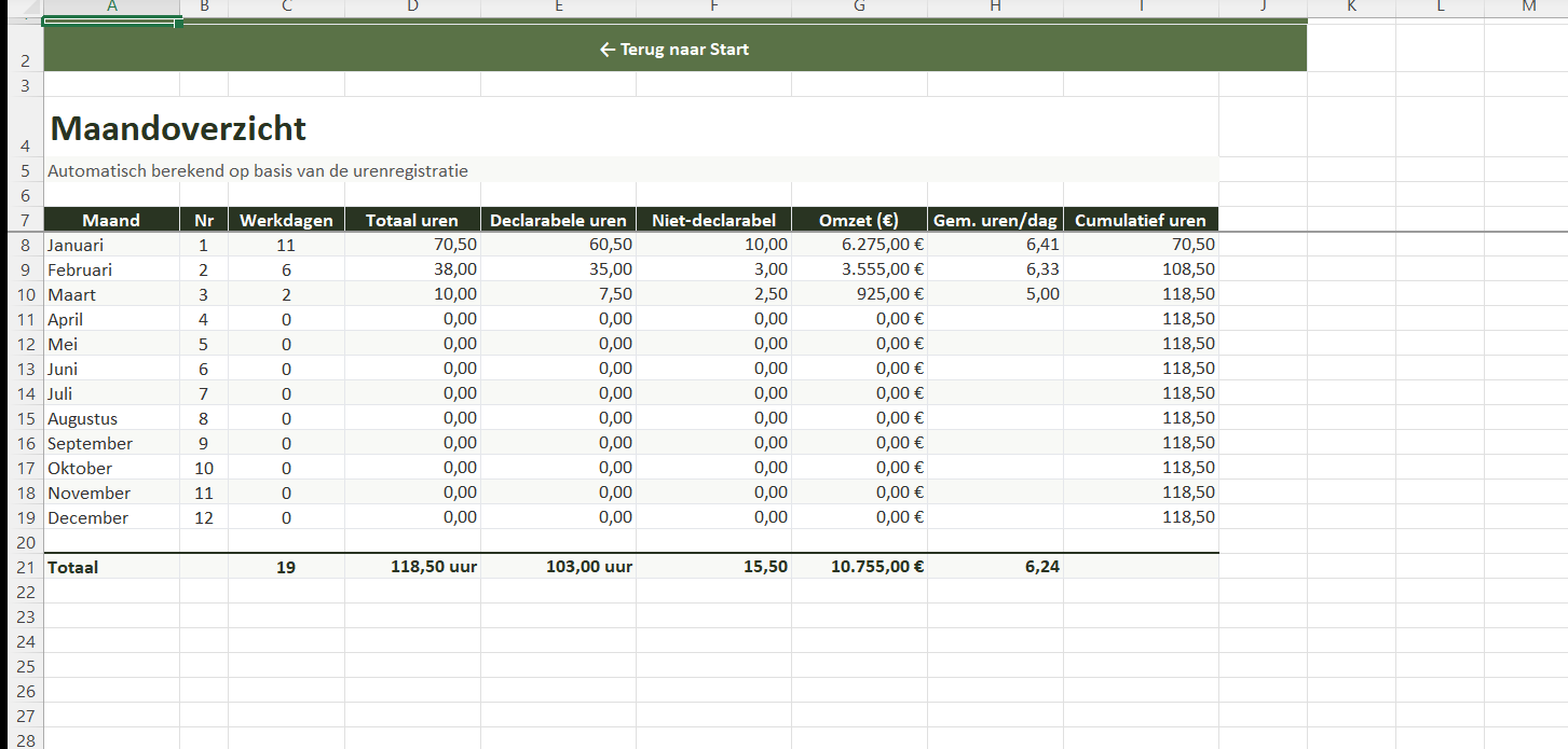 12-maanden overzicht met werkdagen, totaal uren, declarabele en niet-declarabele uren, omzet en gemiddelde uren per dag.