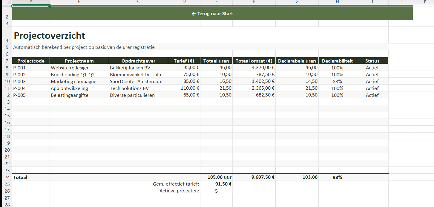 De template bevat 8 werkbladen met meer dan 3.000 automatische formules, 6 grafieken en ruimte voor 400 urenregistraties. Beheer tot 15 projecten met verschillende uurtarieven, volg uw urencriterium-voortgang per maand en krijg direct inzicht in uw declarabele uren en omzet.