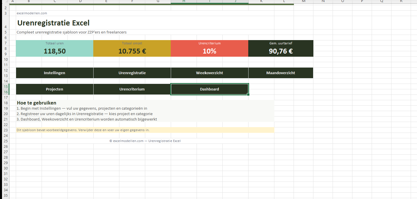Deze Excel-template is een hulpmiddel voor urenregistratie en administratie en vervangt geen professioneel belastingadvies. Het urencriterium en de zelfstandigenaftrek worden jaarlijks door de Belastingdienst vastgesteld. Raadpleeg belastingdienst.nl voor actuele bedragen en voorwaarden. Bewaar deze registratie als onderbouwing voor uw aangifte. De maker aanvaardt geen aansprakelijkheid voor fiscale beslissingen op basis van deze template.