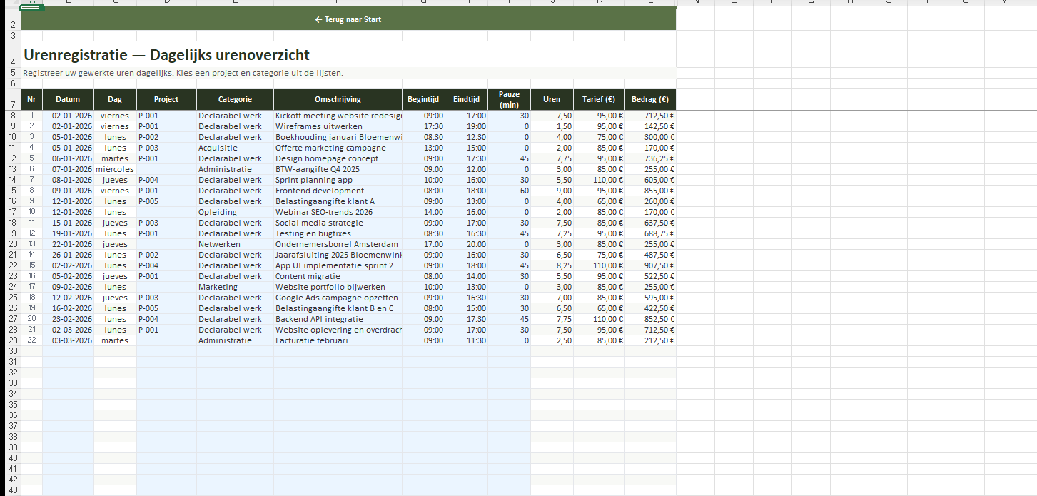 Registreer tot 400 werkdagen met datum, project, categorie, omschrijving, begintijd, eindtijd en pauze. Uren en omzet worden automatisch berekend. Inclusief VLOOKUP voor projecttarieven.