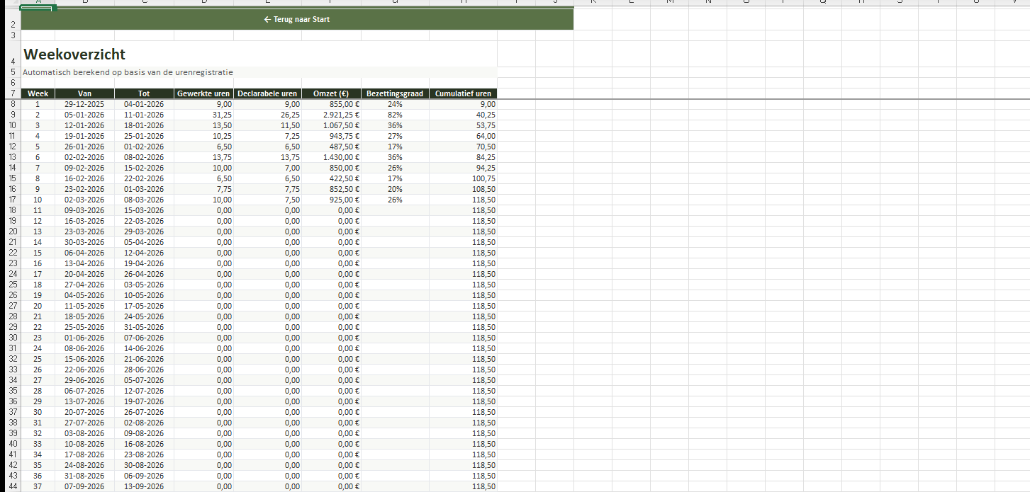 52 weken automatisch berekend met gewerkte uren, declarabele uren, omzet, bezettingsgraad en cumulatief urentotaal voor het urencriterium.