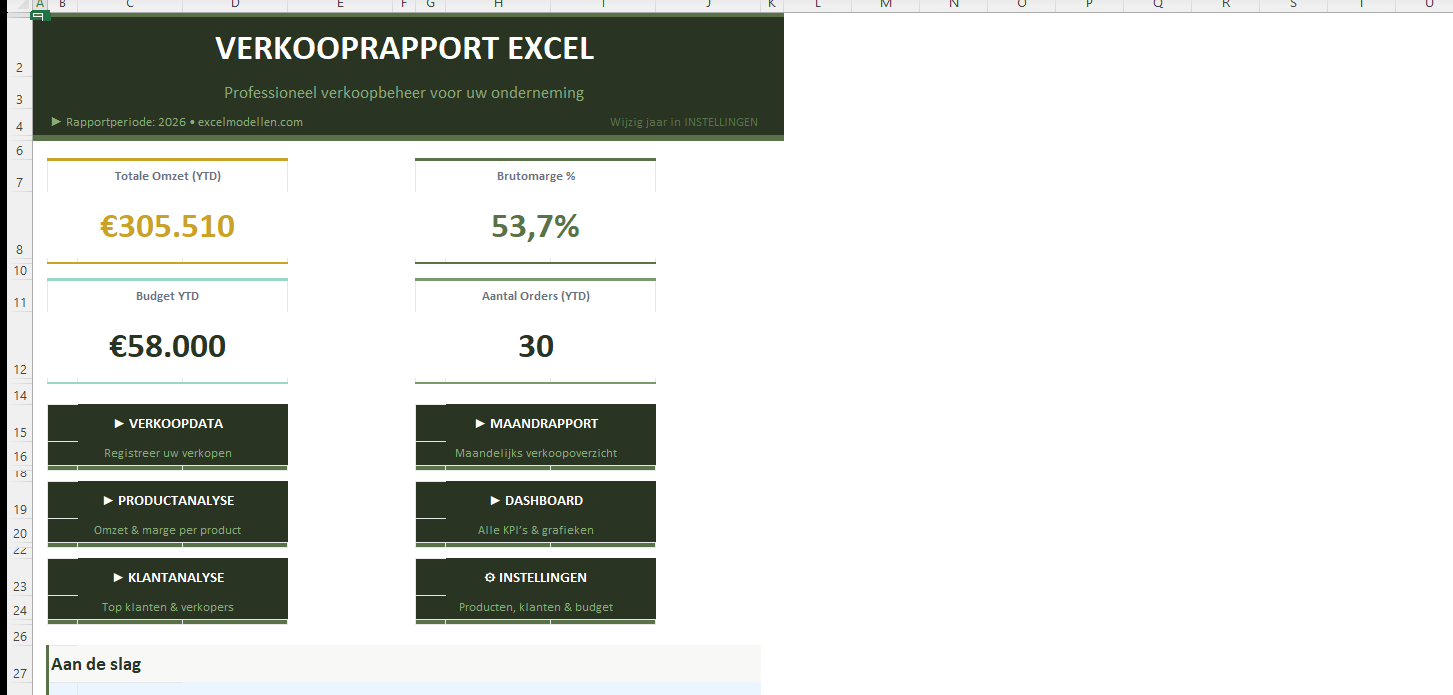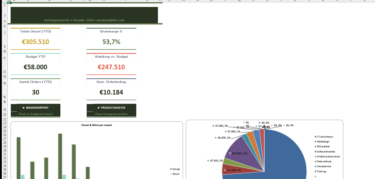 Verkooprapport Excel — automatisch dashboard met omzet, marge en budgetanalyse