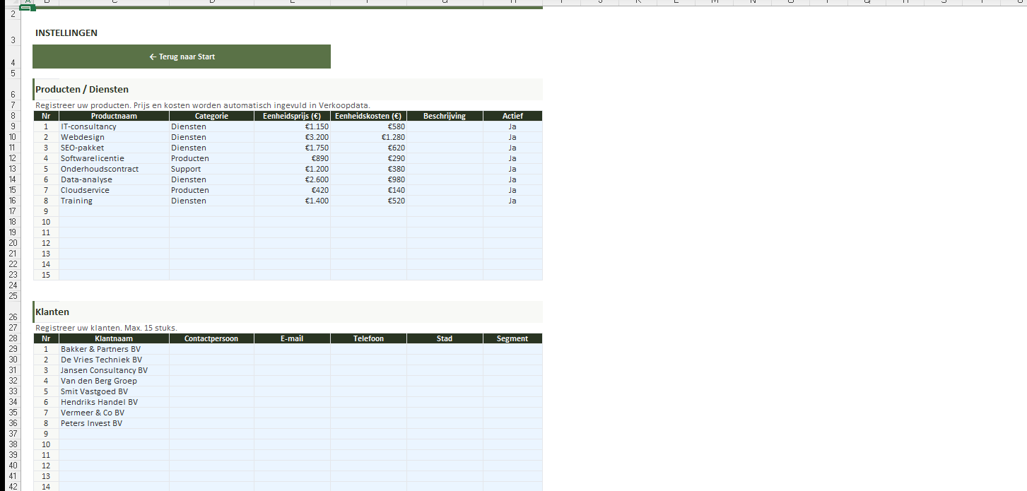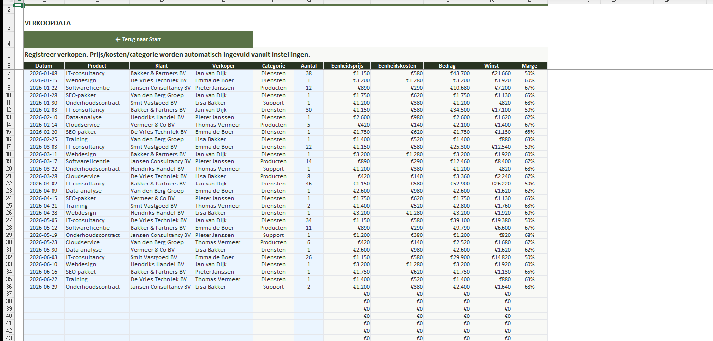 Dit sjabloon is bedoeld als hulpmiddel voor intern verkoopbeheer. Het vervangt geen boekhoudsoftware, facturatiesysteem of fiscale administratie.