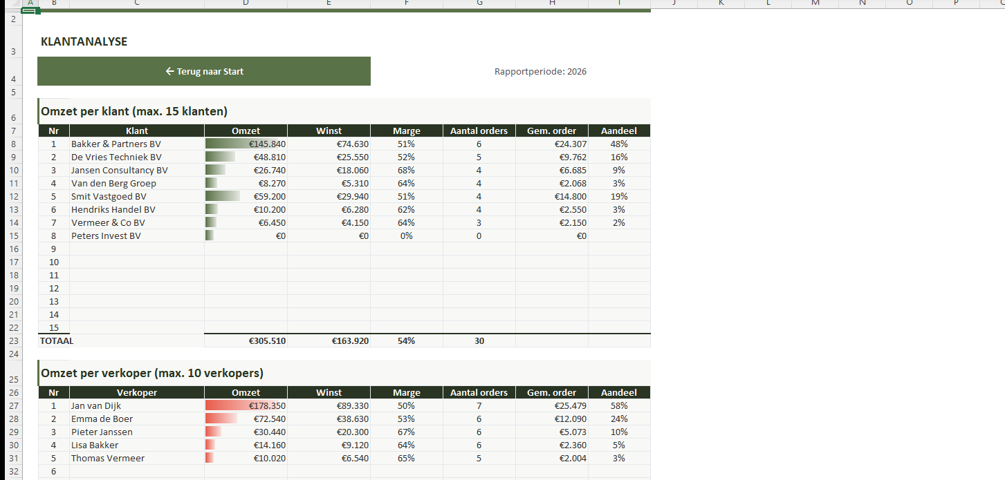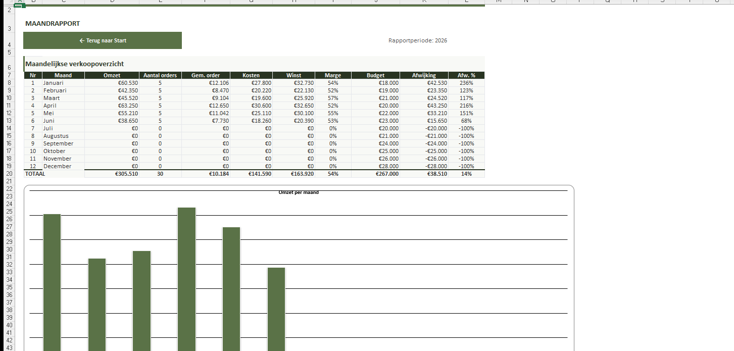 Professioneel verkooprapport met dashboard, maandanalyse en automatische KPI’s