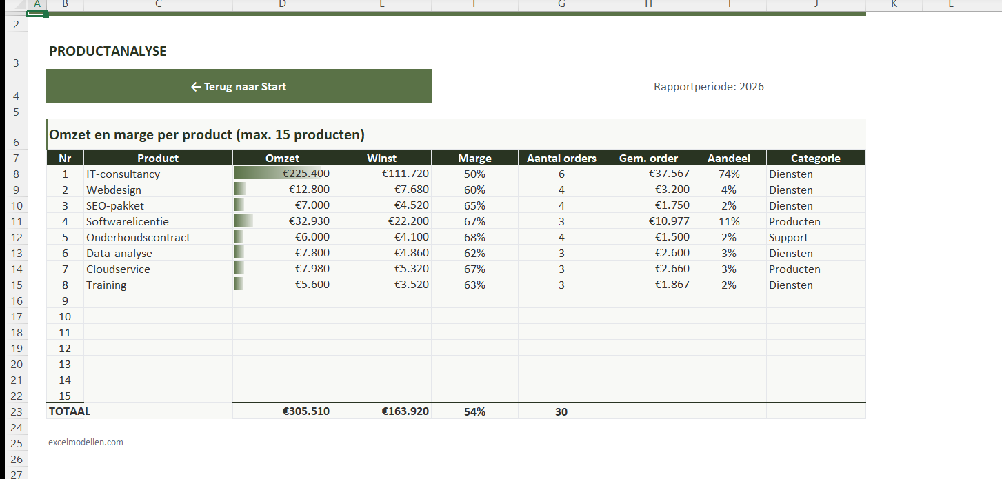 Zoekt u een verkooprapport in Excel waarmee u uw omzet, marge en verkoopprestaties overzichtelijk bijhoudt? Dit sjabloon biedt een complete oplossing — van verkoopregistratie tot visueel dashboard — zonder dat u zelf formules hoeft te bouwen.